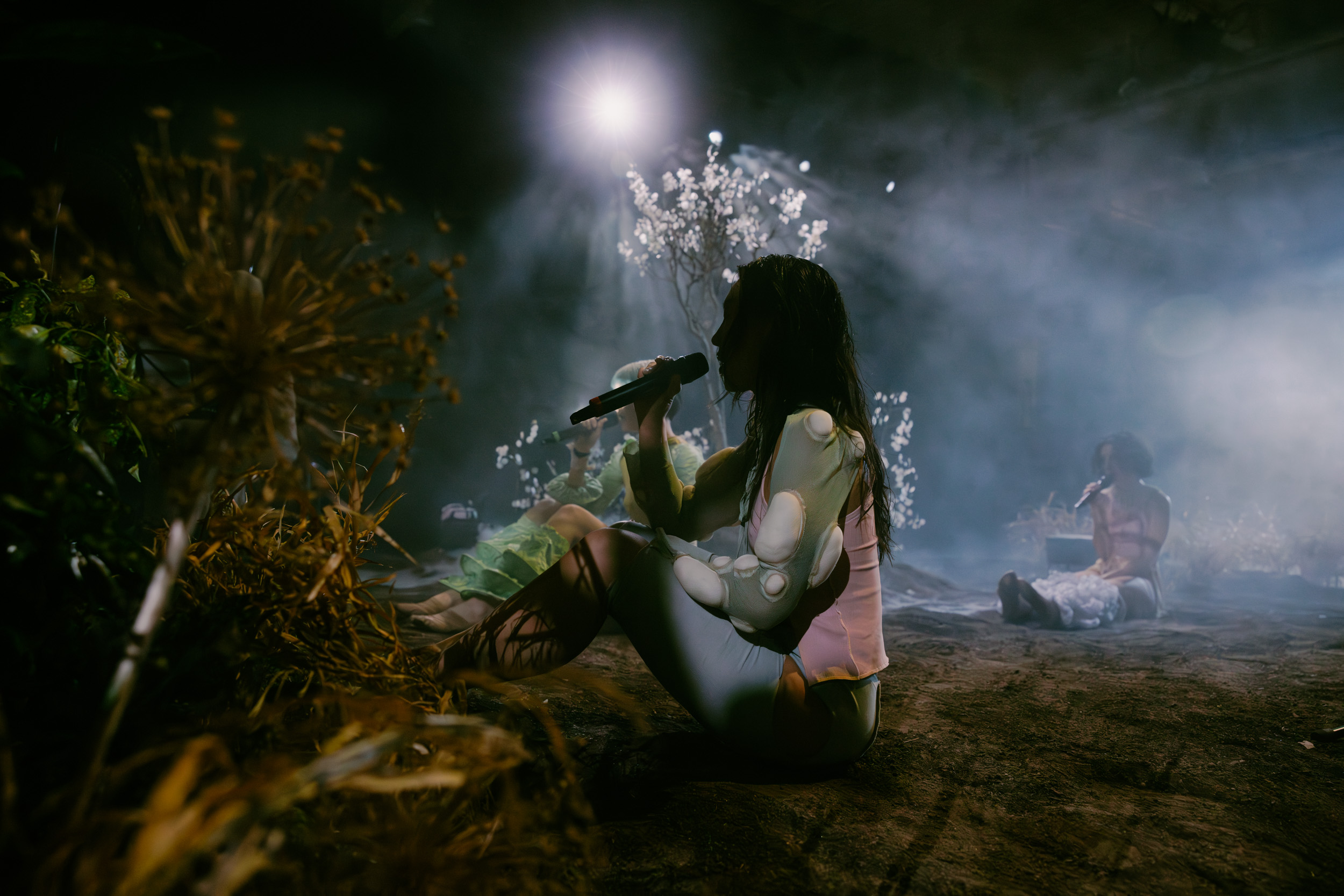 This performance uniquely combines pleasing harmonies and dissonances generated by AI, triggered by the tactile interaction of Nam's flesh and her vocalizations. These sonic elements, encompassing both unidentified voices and Nam's own, are intricately woven together, underscoring the artist's role as a live conductor. Using her body and movement, she navigates through space, her energy guiding to produce sounds that harmonize, diverge, and reconvene in unexpected ways.